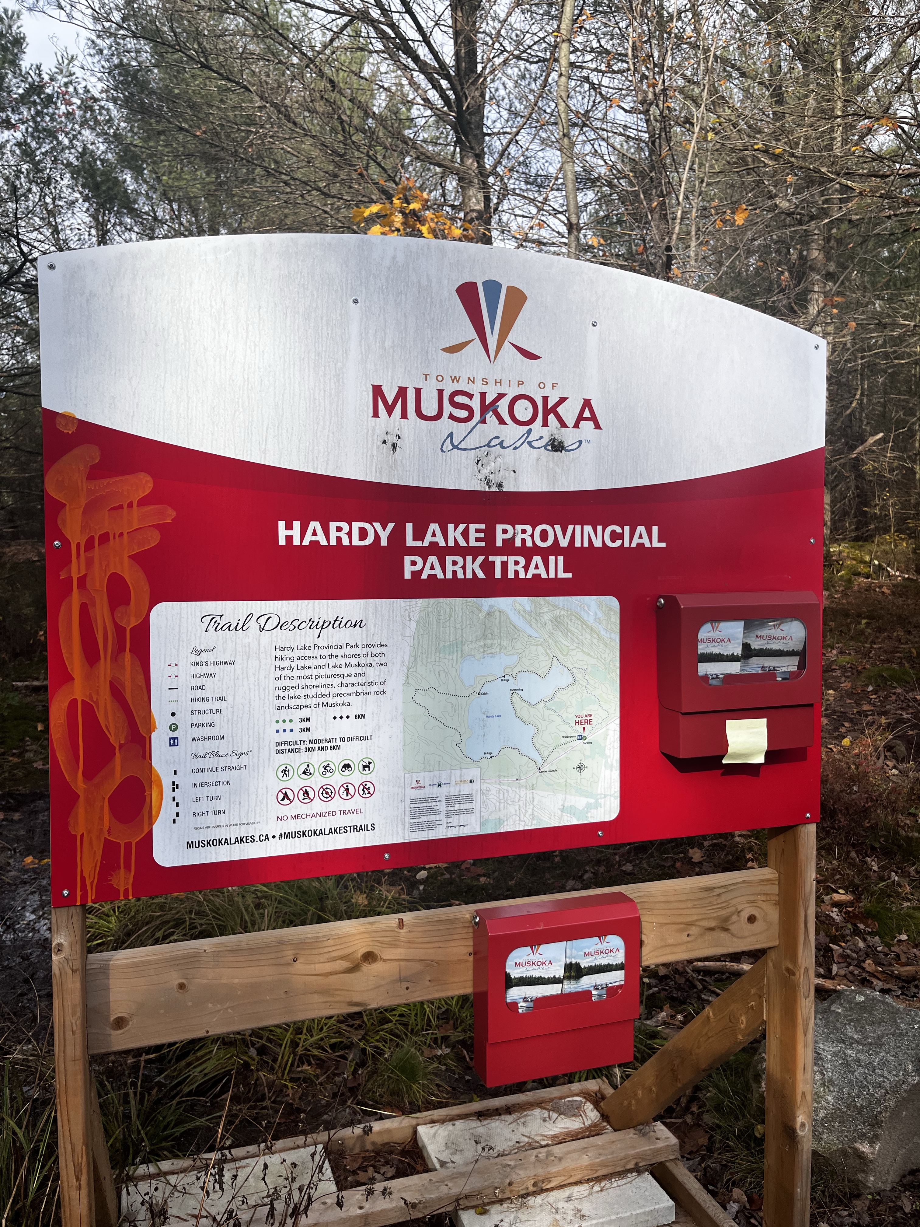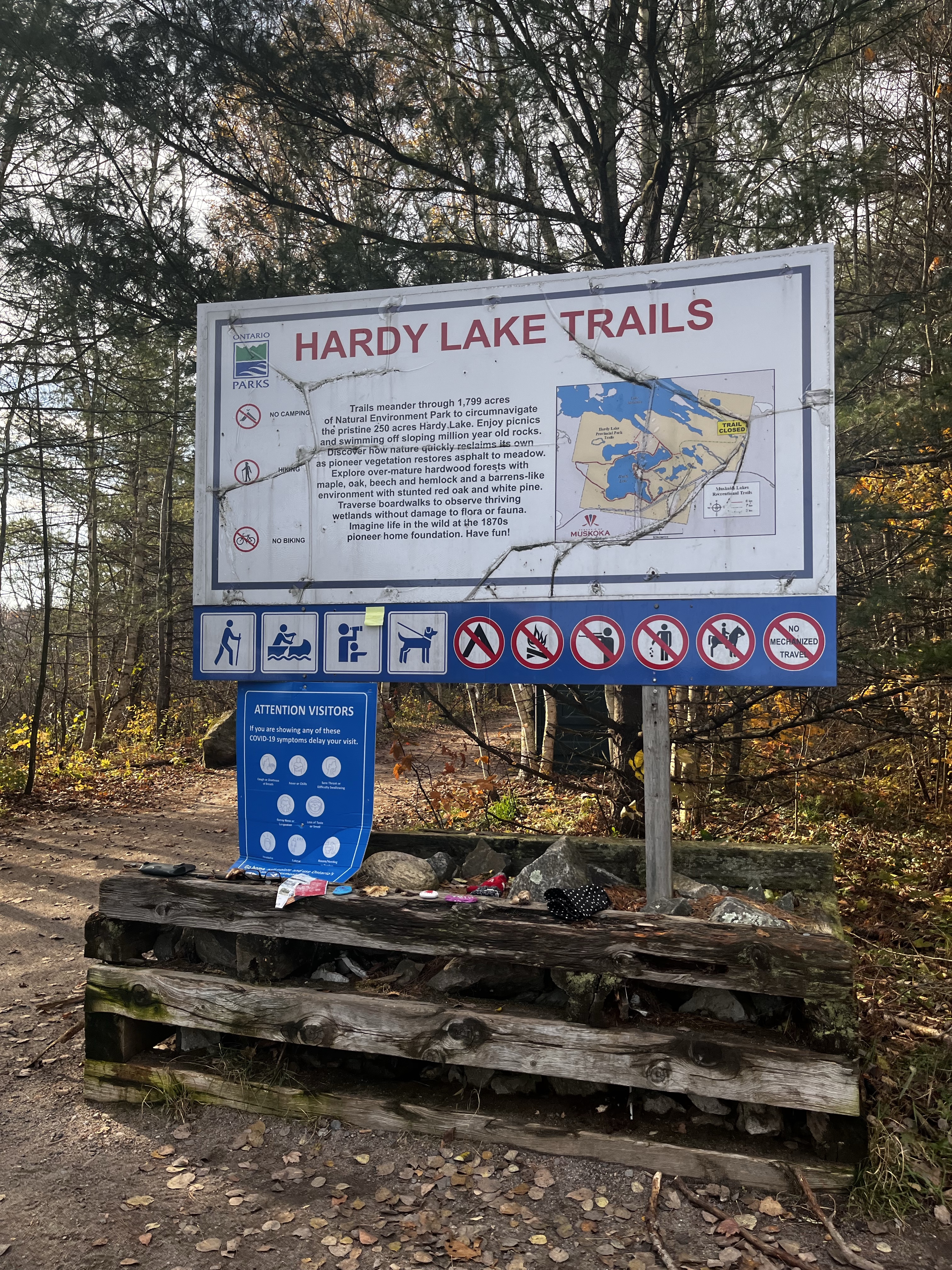 Hardy Lake is a small, non-operating provincial park. It’s very easy to cover most or all of the land in one visit, however I’d like to come back in the winter. I found the trails to be very easy, the only moderate parts were rerouting around muddy areas.