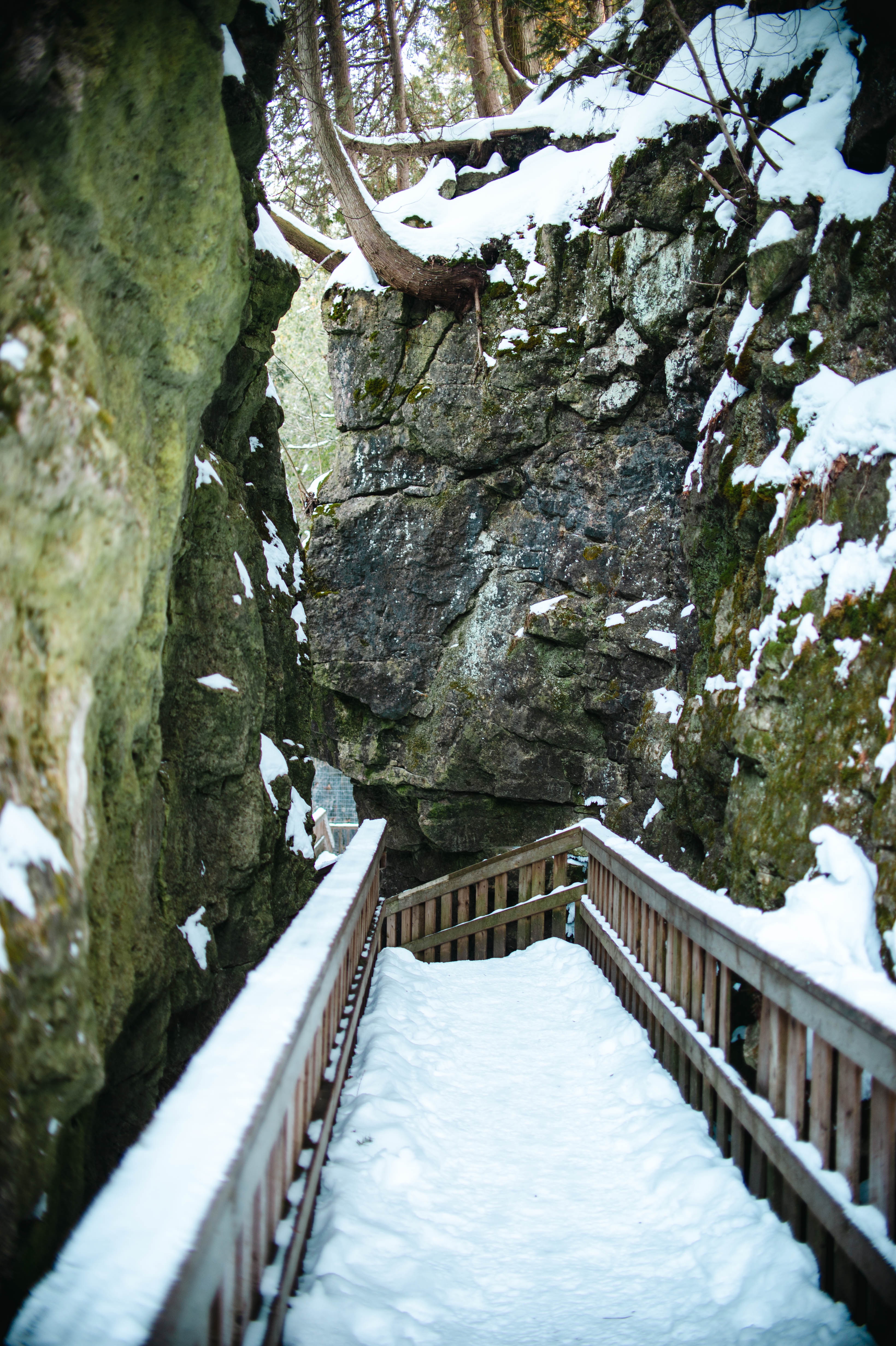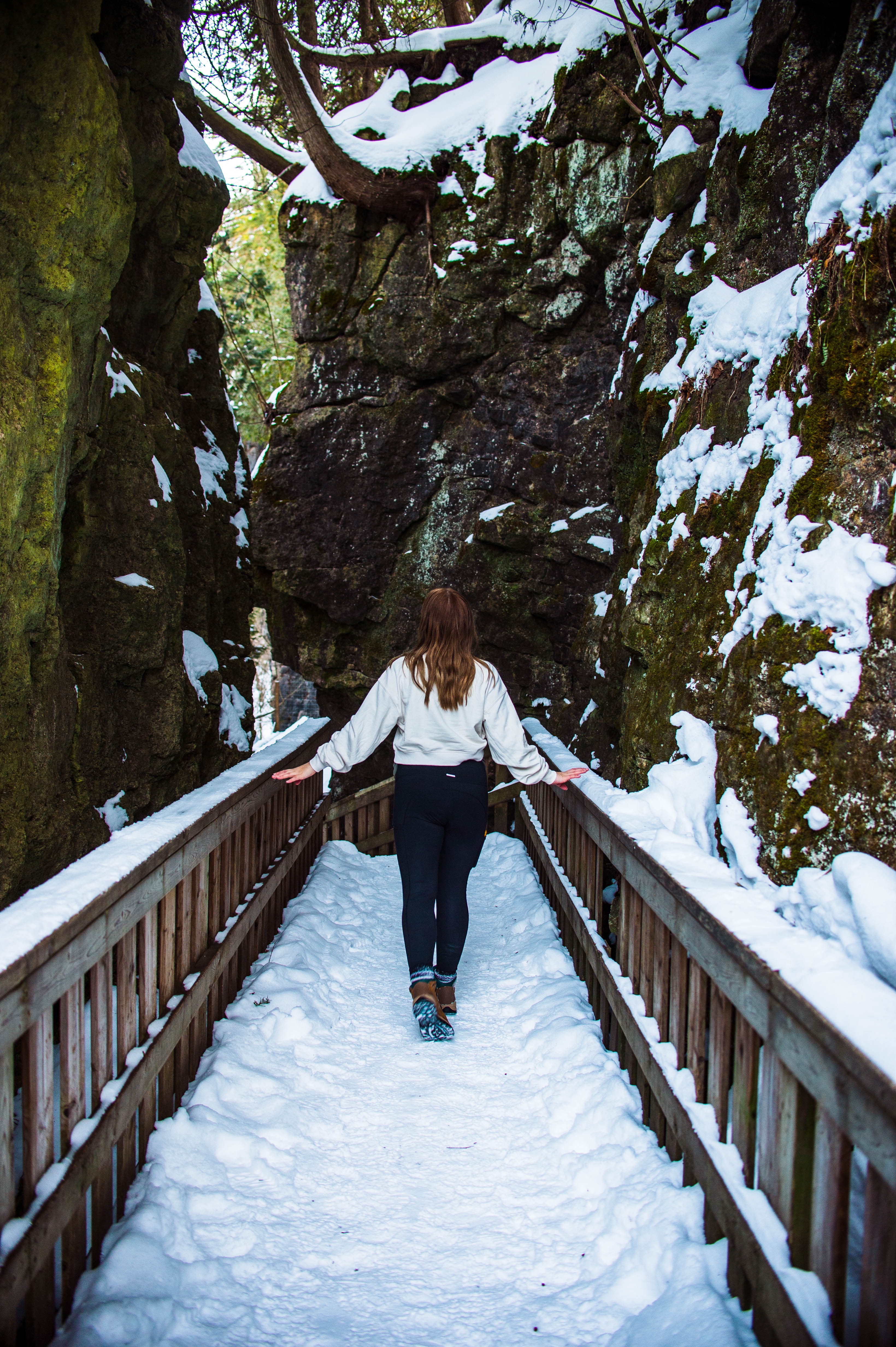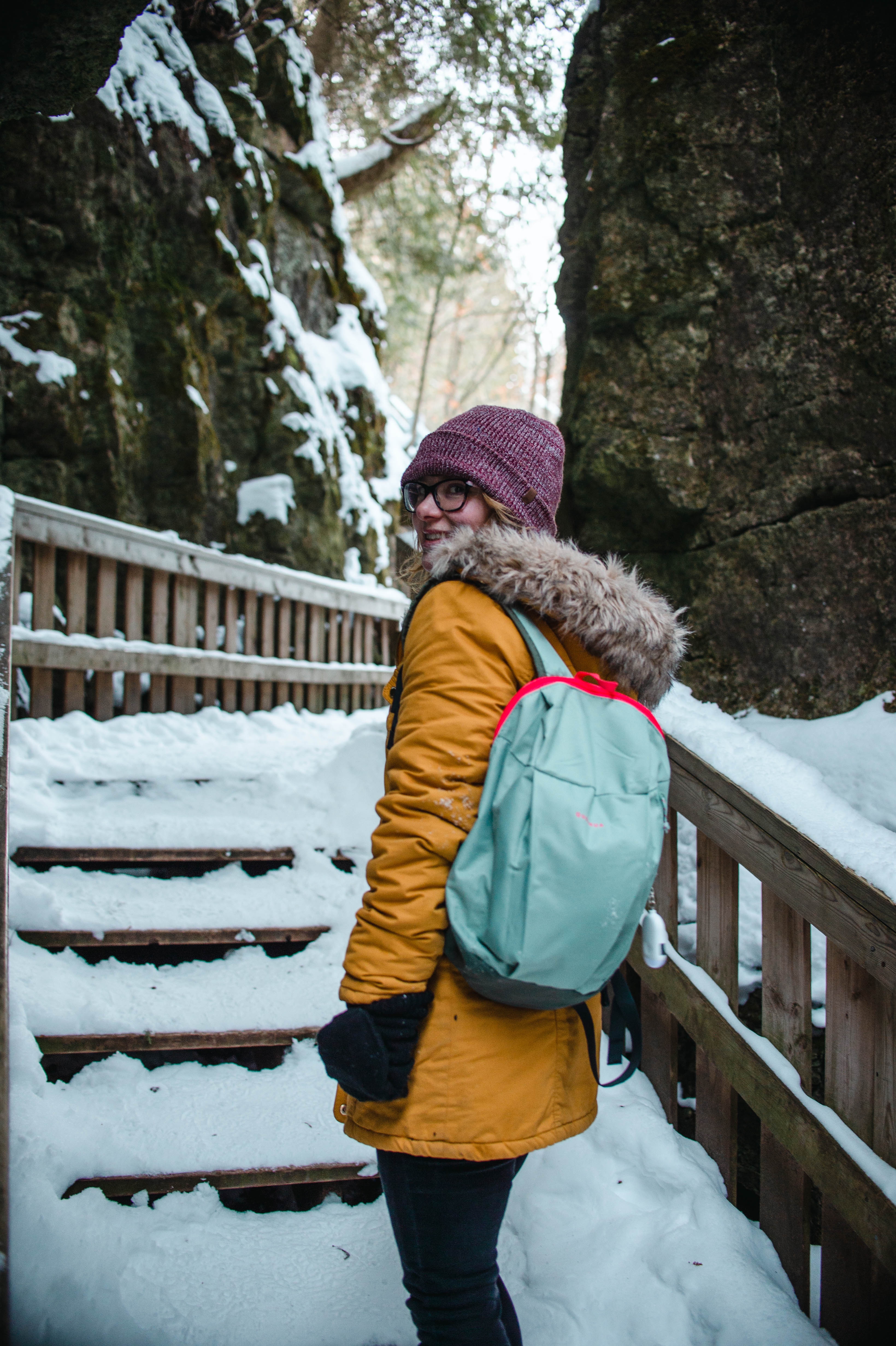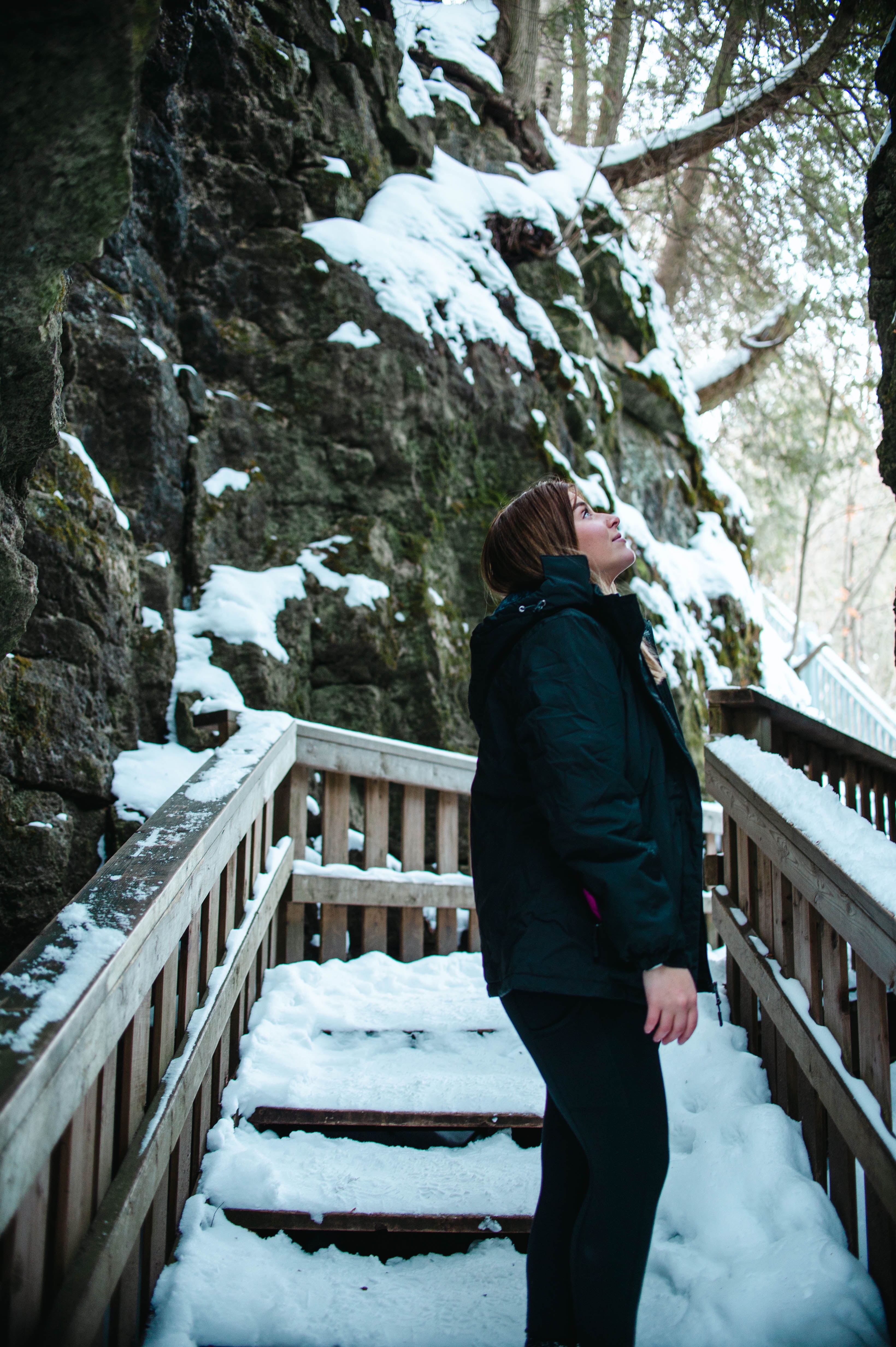 The lookout is astounding, and I prefer it in Winter when covered with bits of snow. when taking the photo of me walking into the lookout, I put my glove down and it fell off the cliff; so heads up! If you see a purple glove, please return to me. My hand froze for the rest of the adventure!