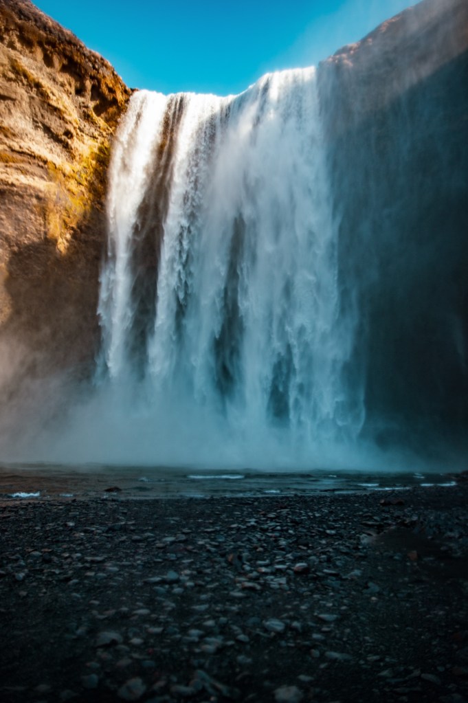 This day was full of waterfalls as our next stop was to Skogafoss. Skogafoss is one of Iceland’s biggest waterfalls, and on a sunny day you’ll see a rainbow or two there. You can get as close as you want to the waterfall (so again, you’ll likely get wet) and you can also climb the staircase to see the waterfall from the top. A local we met here told us of a legend here; it is believed that behind this waterfall you can find a chest filled with gold and possibly other treasures.