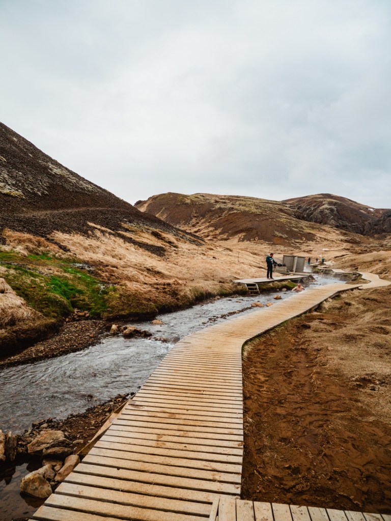 The last outdoorsy stop of this day was a 7KM hike to the Reykjadalur Geothermal River. This hike was beautiful, lots of incline but worth it the entire way. Once we got to the main spot we were in awe. This is one of the highlights of the trip for me, too. I need to come back here ASAP and go in the morning next time. I had read on a blog post that the river is hotter the further up you go, but for clarity, the river (I’m only talking about at the boardwalk section of the trail) starts as cold and then as you walk up the boardwalk it gets hotter and hotter, to a point where you aren’t allowed to swim beyond the boardwalk because the temperature becomes THAT hot. Wild!