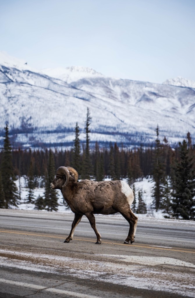 Bighorn Sheep – Known for their large, curled horns, bighorn sheep can be spotted along cliff sides, where they seek shelter from the cold winds. We saw them a few times on our trip, each time with them in the middle of the road – drive carefully!