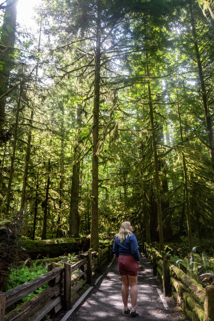 - Midday walk through Cathedral Grove — home to towering old-growth Douglas firs. It gets busy here so recommend arriving as early as possible. There are also washrooms here!
